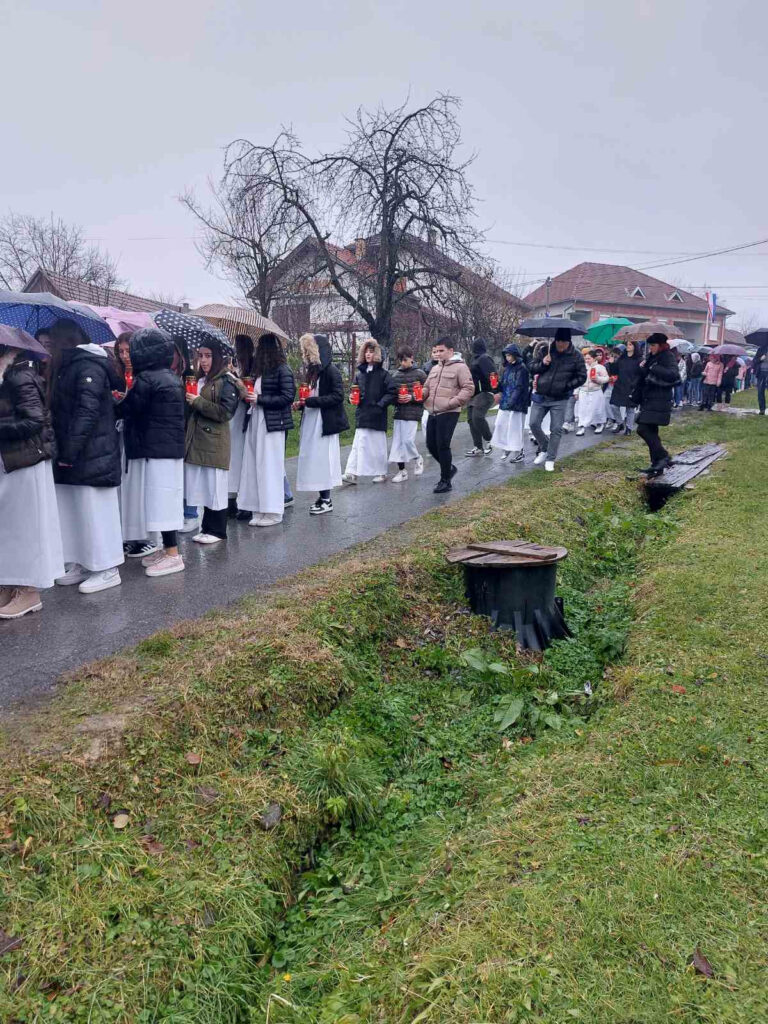 U pokorničko-molitvenoj procesiji sa zavjetnim svijećama   hodočasnici su se zaputili u prostor voćinske bazilike gdje je uz spomenik “U Majčinu naručju” položen vijenac u čast voćinskih žrtava, a potom je biskup predvodio koncelebrirano misno  slavlje.